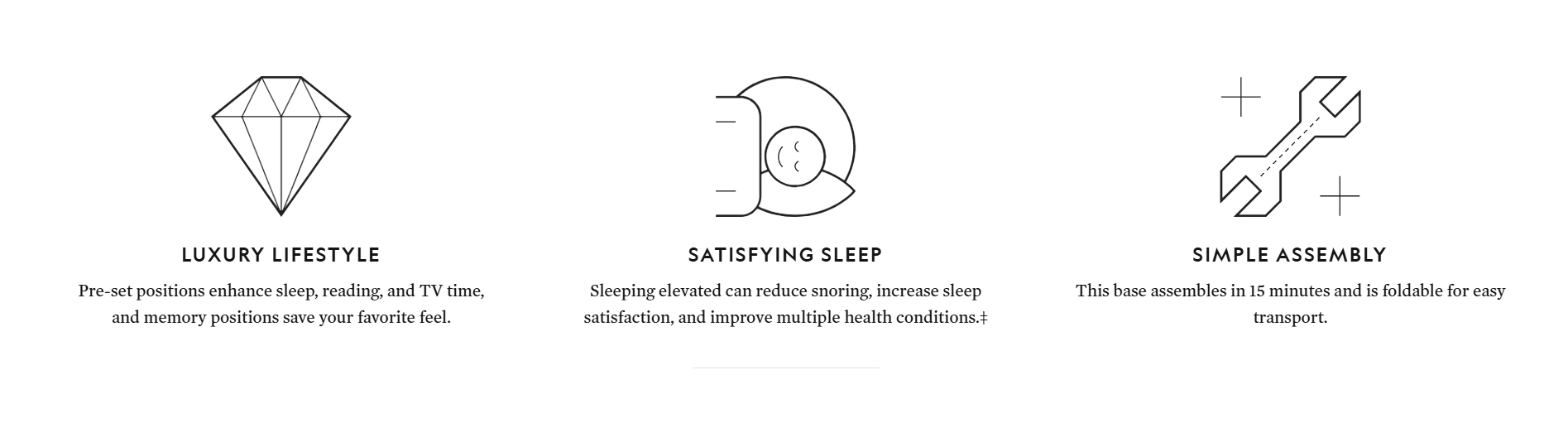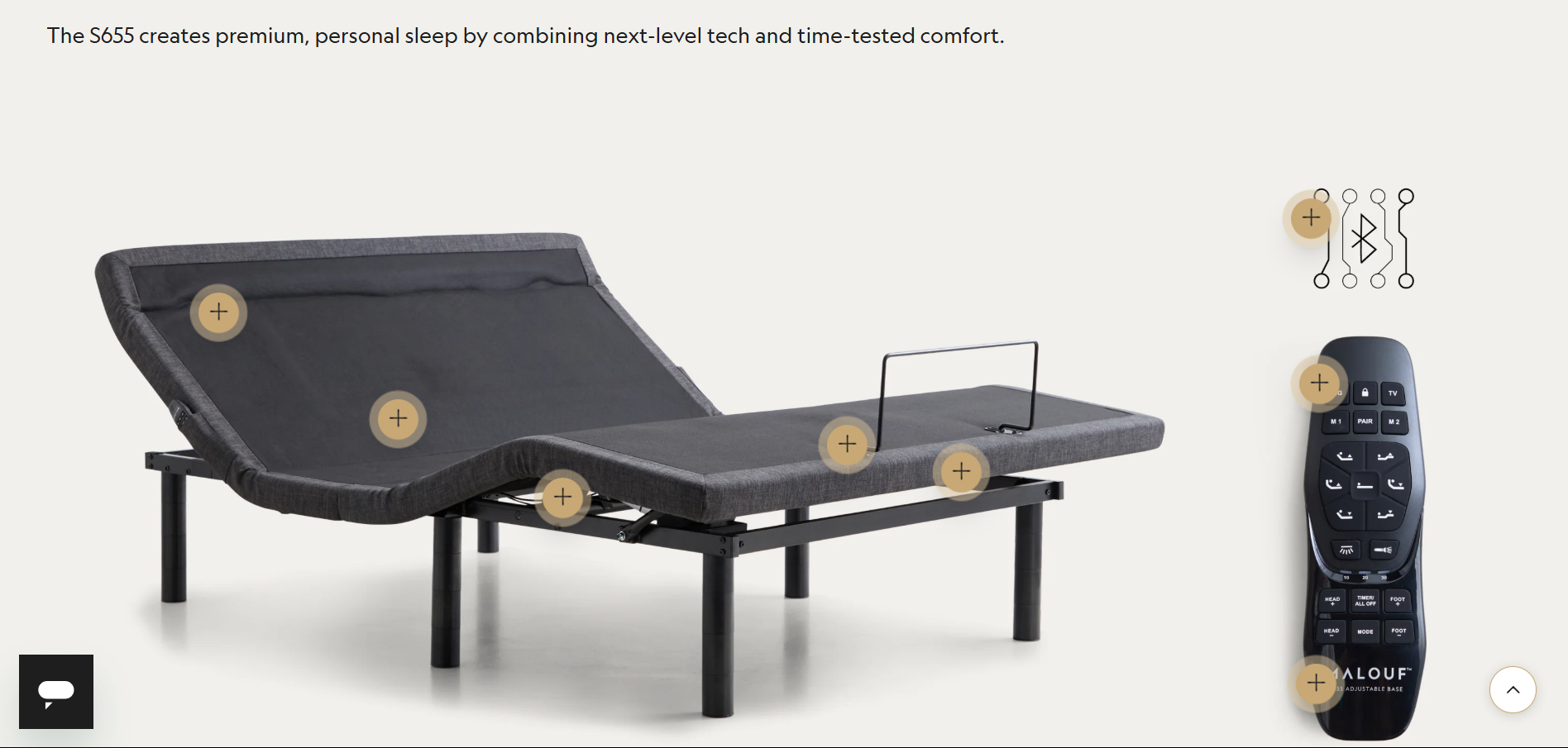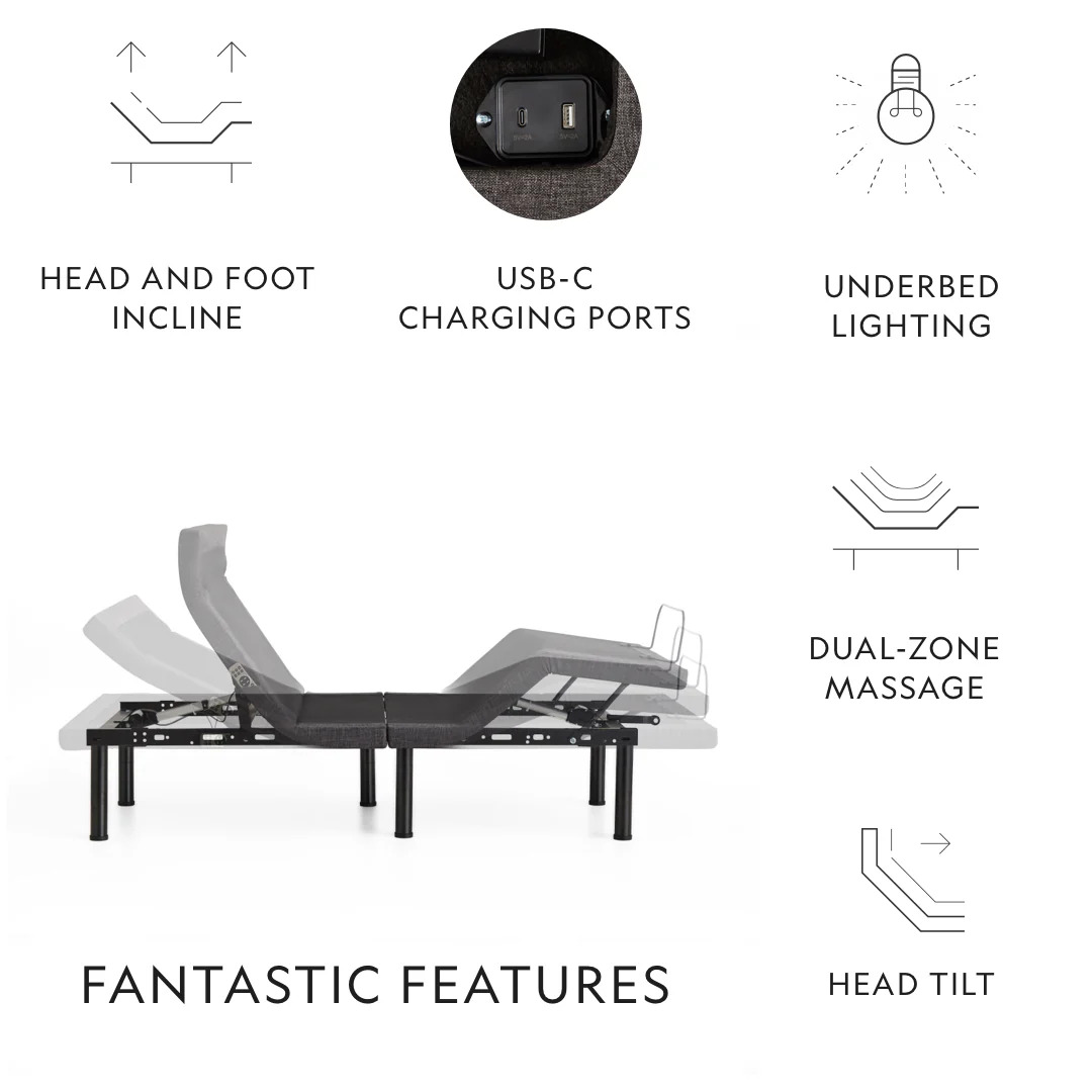 The S655 adjustable bed base equals peak relaxation. It’s endlessly customizable and easy to use, with premium features like dual-zone massage, head tilt, and Bluetooth®-assisted snore detection.