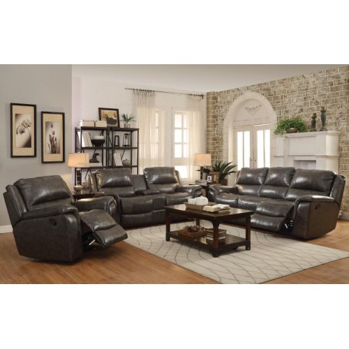 Soothe yourself with a magical power sofa with love seat and recliner. Polyester fiber filled cushions provide exceptional lumbar support. Top grain leather matches the two-tone charcoal upholstery to ensure durability. Scoop seating allows a craddled sensation for extra comfort.