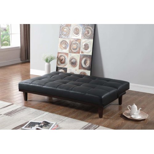 Sofa bed upholstered in BLACK leatherette-EXPOSED SOLID WOOD frame and LEGS FINISHED in CHESTNUT