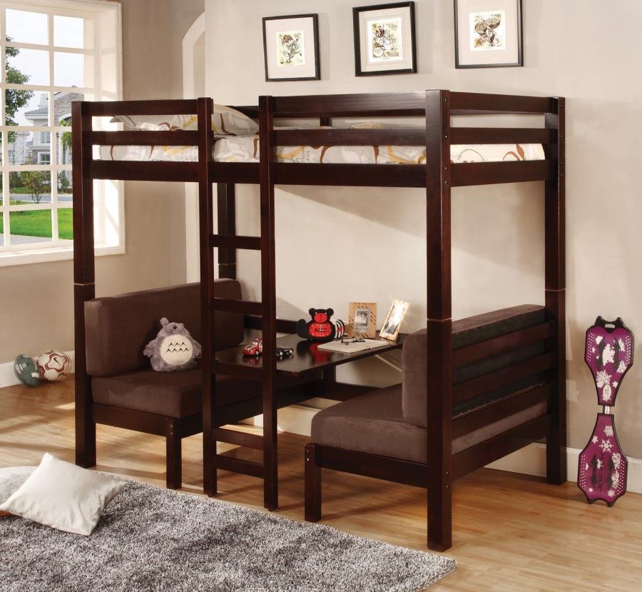 THIS ENDEARING COLLECTION FEATURES A TWIN OVER TWIN CONVERTIBLE LOFT BED. CONSTRUCTED WITH SOLID PINE THE BOTTOM TIER EASILY TURNS BED TO SEATING AREA WITH TABLE. CUSHIONS INCLUDED. IT SEPARATES INTO TWO SINGLE BEDS. AVAILABLE IN MEDIUM BROWN AND WHITE.
