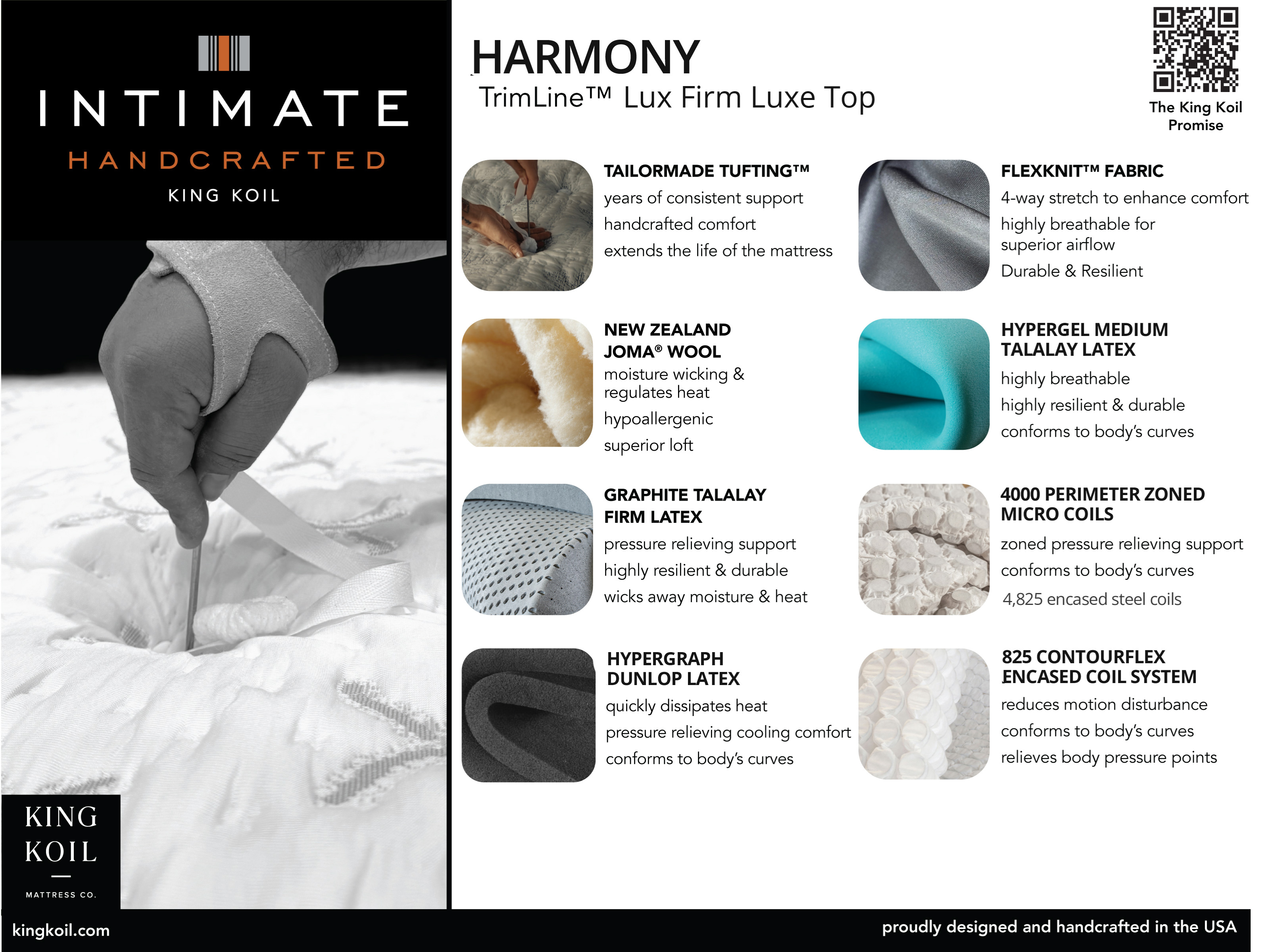 • Comfort Layers: Graphite Infused Talalay Latex,, King Koil Plush Signature Foam, 4,000 Zoned Micro Coils