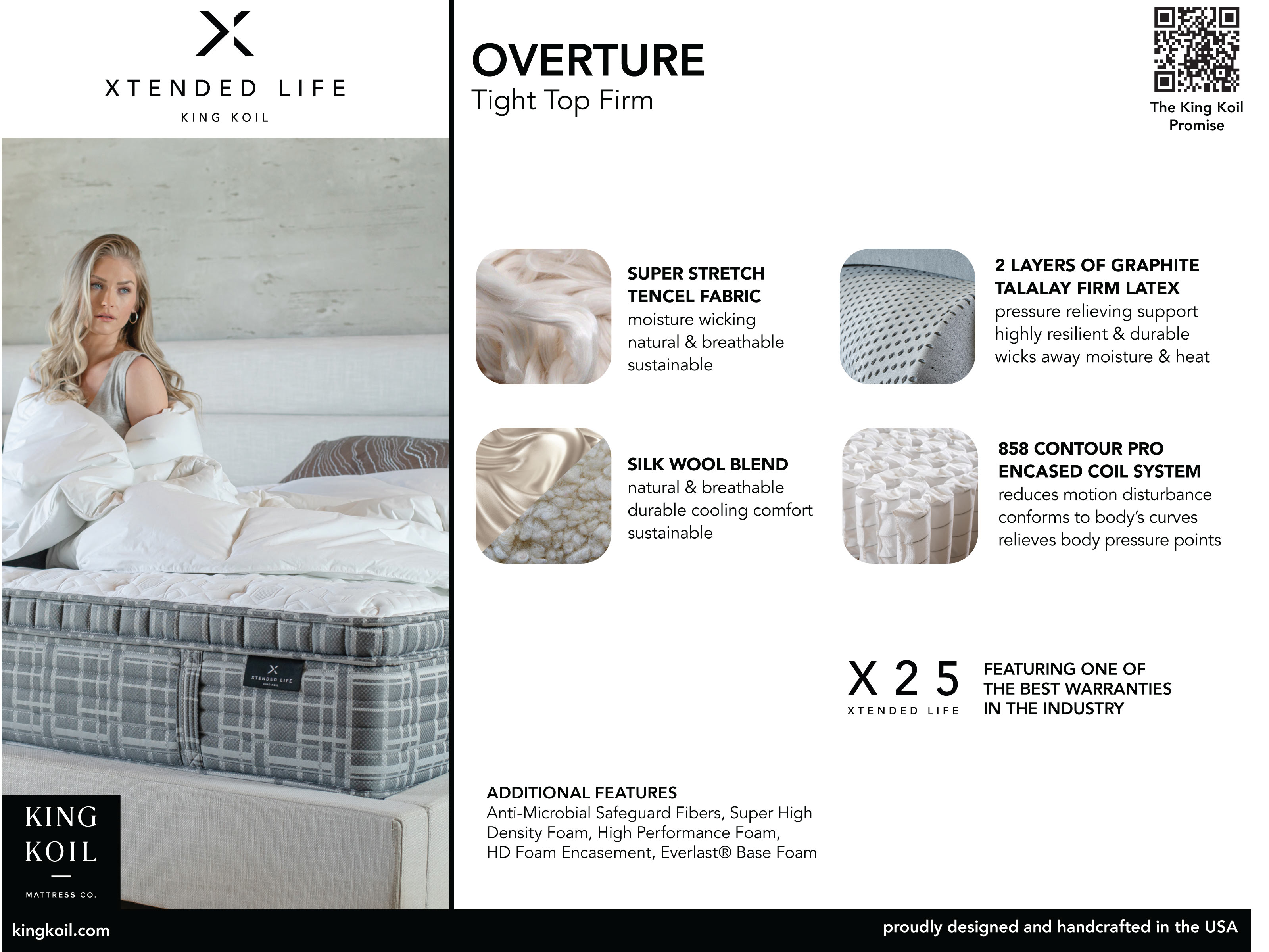 The King Koil Extended Life mattress features a 25 year warranty at .5'' body impression. Built and tested for Big and Tall but Comfortable for all. High Density Quilt, 2'' of Graphite Infused Talalay Latex.