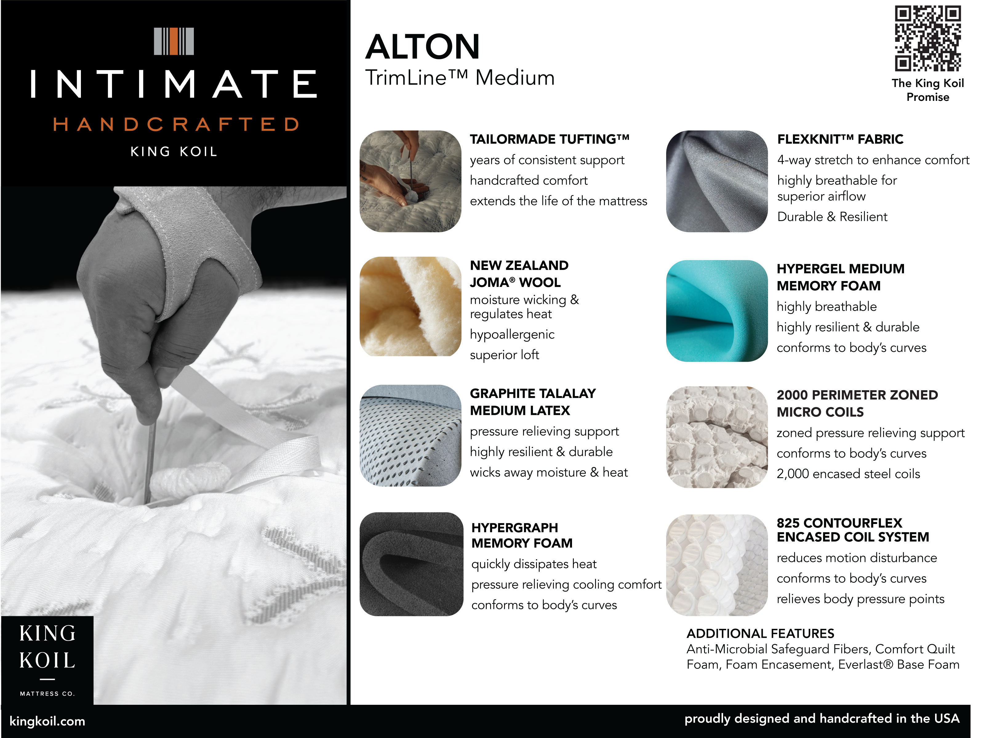 • Comfort Layers: Graphite Infused Talalay Latex,, King Koil Plush Signature Foam, 4,000 Zoned Micro Coils