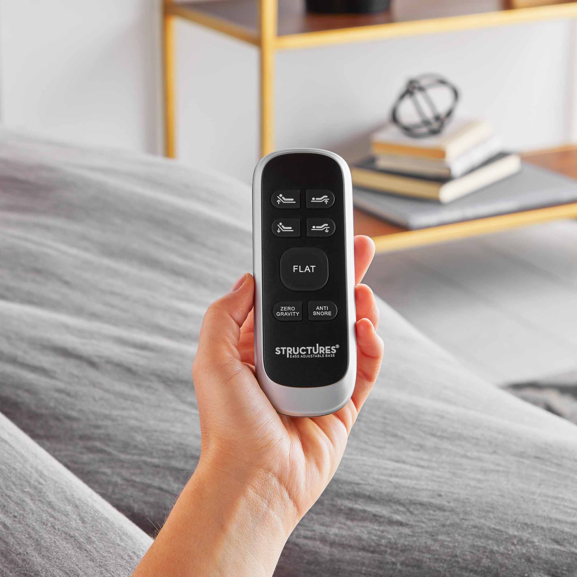 The Structures™ E455 Smart Adjustable Bed Base combines luxurious sleep with the health benefits of sleeping elevated for the perfect night’s rest. With an independent head incline up to 60 degrees and a foot incline to 45 degrees, your comfort is customizable. The base comes with three preset positions (Zero Gravity, Anti-Snore, and Flat), and two programmable positions can be personalized and saved (using the Zero Gravity and Anti-Snore buttons). Studies have shown that sleeping elevated can help relieve back pain, ease sleep apnea and snoring, and reduce acid reflux and heartburn.